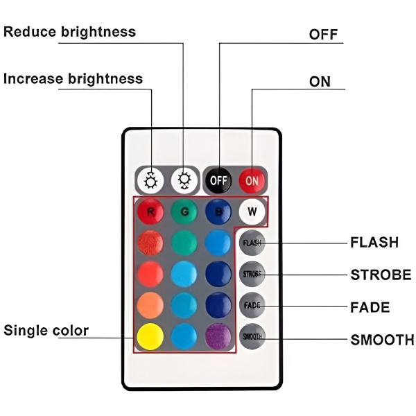 O AQUASHEIN vem com um comando prático que lhe permite ajustar a iluminação com facilidade. Com 24 teclas, pode escolher entre 16 cores RGB e quatro modos dinâmicos (flash, piscar, desvanecer, suave). Pode controlar as luzes a uma distância de até 10 metros, garantindo uma personalização sem complicações.