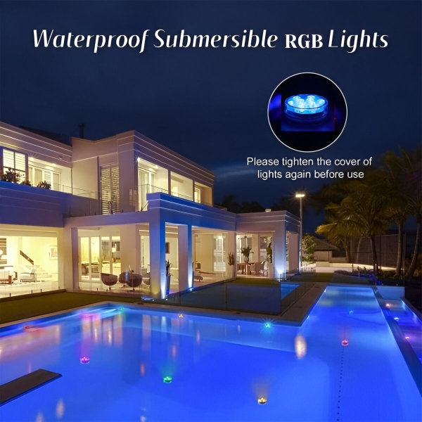 Sem fichas e totalmente seguro! Melhore o ambiente de qualquer piscina, de um tanque ou até de um aquário com facilidade. Estas mini luzes aquáticas com cores vibrantes vão melhorar e dar um ar novo à sua piscina, aquário, vaso ou qualquer decoração. Quer esteja a organizar uma festa ou a desfrutar de uma noite tranquila, estas incríveis luzes RGB irão elevar o seu ambiente instantaneamente.