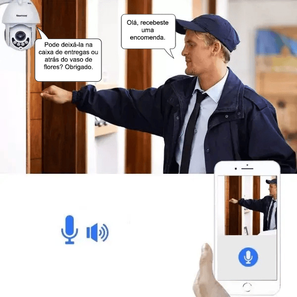 Com o microfone responsivo integrado na câmara de segurança exterior, pode ouvir e falar através da nossa aplicação.  O áudio bidirecional permite-lhe comunicar com os seus convidados, enquanto que o alarme de deteção de movimentos o ajuda a livrar-se rapidamente de visitantes ou animais indesejados.