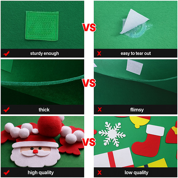 Feitos do mesmo feltro pesado de alta qualidade. Prendem-se com tiras de velcro costuradas (ao contrário das coladas mais baratas). Exemplos incluem sinos, presentes, boneco de neve, doces e flocos de neve. A árvore tem uma estrela para o topo e um tronco para a base. O velcro é costurado na árvore para fixar ambas as peças de forma segura.