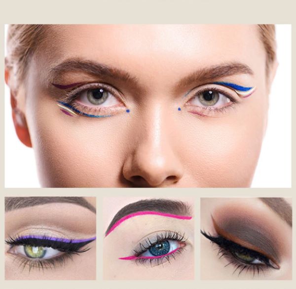 Crie o clássico delineado “gatinho” com preto, adicione um toque de cor com roxo ou azul, ou ouse com amarelo e verde para festivais e festas. Misture e combine cores para efeitos ombre únicos. Perfeito para looks naturais do dia a dia, maquilhagem dramática de noite ou designs artísticos criativos. Um kit substitui toda a sua coleção de delineadores.